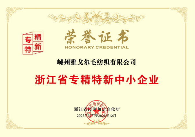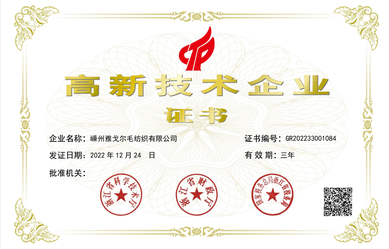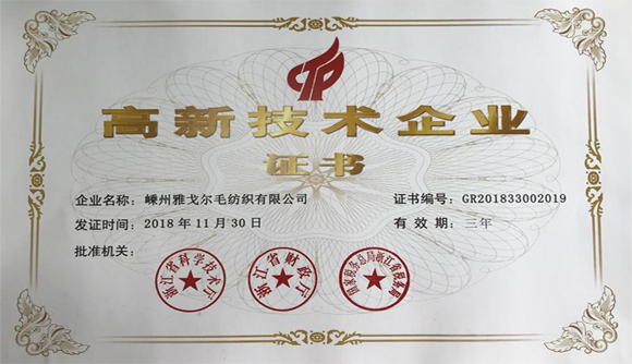雅戈尔毛纺被浙江省科技厅认定为高新技术企业。