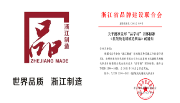 雅戈尔毛纺制定的《抗皱纯毛精梳毛织品》 “浙江制造”团体标准,通过了浙江省品牌建设联合会审批,自2021年10月2日起发布实施。