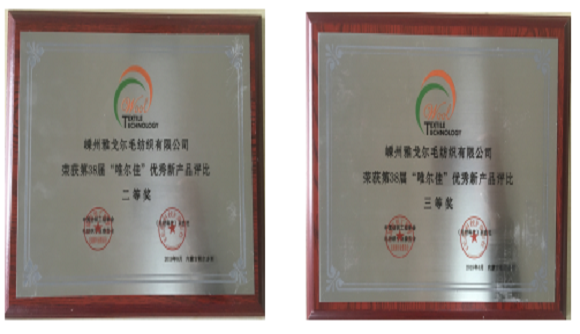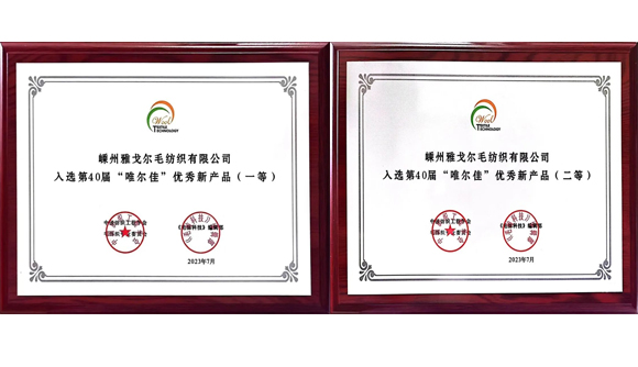 雅戈尔毛纺荣获第38届“唯尔佳”优秀新产品评比二等奖和三等奖。
