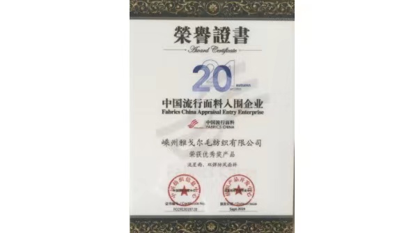 雅戈尔毛纺研发的流星雨、双弹防风面料荣获中国流行面料优秀奖。