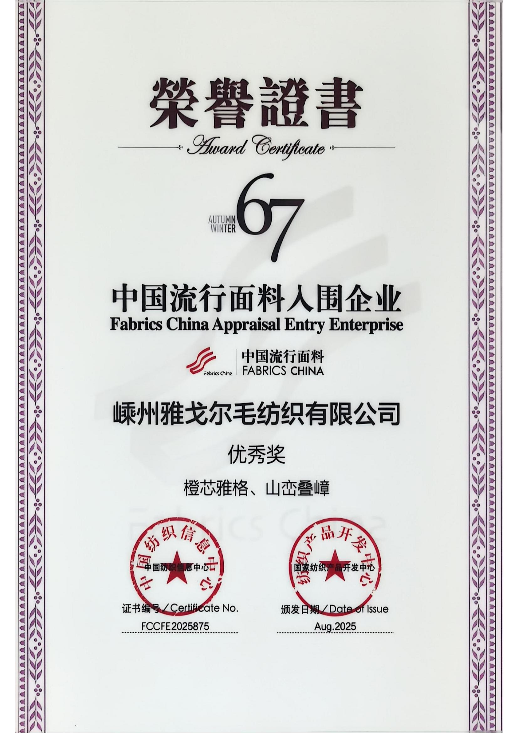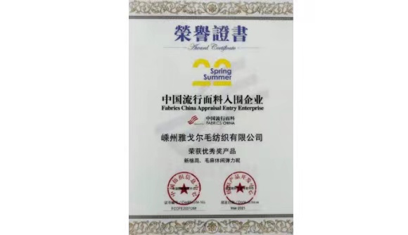 雅戈尔毛纺研发的峰峦叠翠、麻代尔羊毛衬衫面料和仿针织休闲呢均被评为中国流行面料优秀奖。