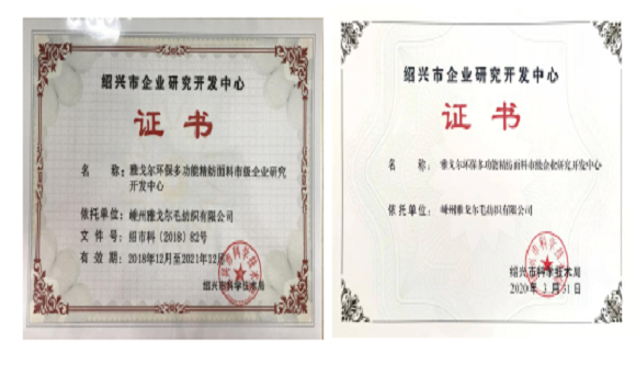 雅戈尔毛纺企业研发中心被绍兴市科学技术局认定为绍兴市企业研究开发中心。
