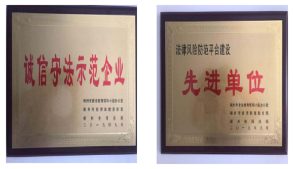 雅戈尔毛纺荣获嵊州市政府颁发的“嵊州市诚信守法示范企业”、“嵊州市法律风险防范平台建设先进单位”荣誉称号。