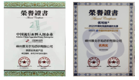 经中国纺织工程学会毛纺织专业委员会、《毛纺科技》编辑部认证,雅戈尔毛纺荣获第41届“唯尔佳”优秀新产品设计大赛一等奖2个、二等奖2个、三等奖7个。