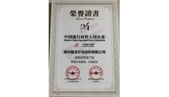 公司选送的“多组分泡泡呢”、“幻境双生”面料荣获优秀奖。