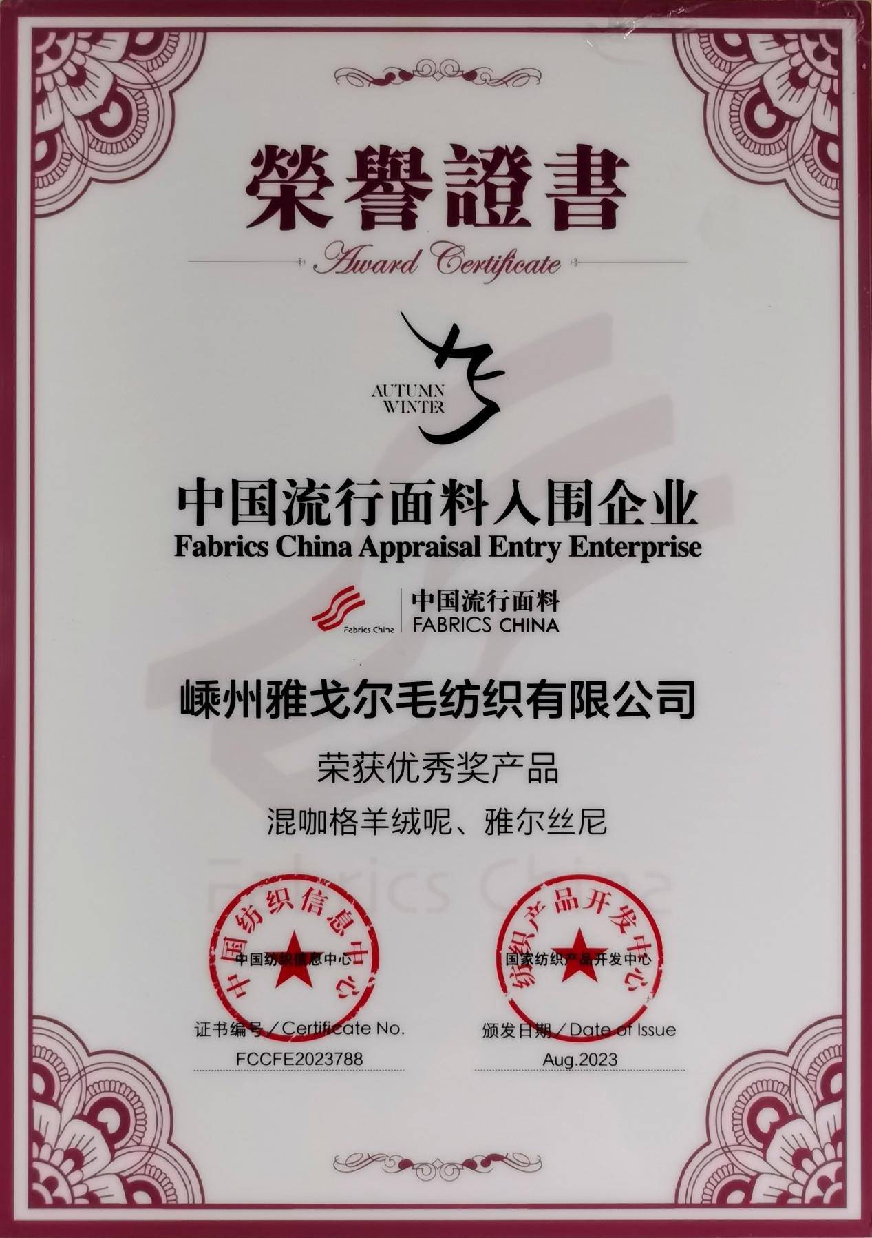 公司选送的“毛丝绒衬衫面料”荣获“最佳匠心品质奖”,“绒面提花呢”荣获“艺术设计奖”,“纯毛双面短顺呢”荣获“匠心品质奖”