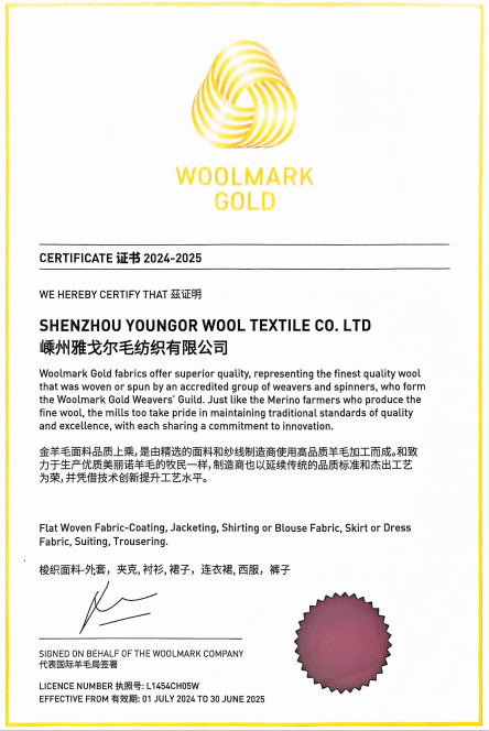 雅戈尔毛纺被国际羊毛局授予“金羊毛”标志,全国仅5家企业获得该荣誉,代表产品品质国际领先。