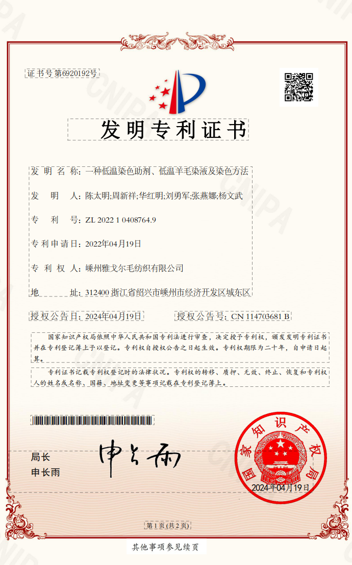 经国家知识产局审查,雅戈尔毛纺研发的“一种低温染色助剂、低温羊毛染液及染色方法”被授予专利权,获得发明专利证书。
