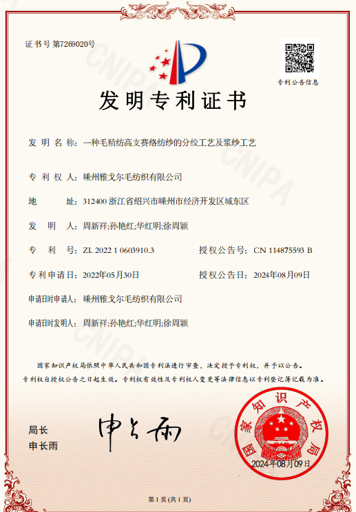 经国家知识产局审查,雅戈尔毛纺研发的“一种毛精纺高支赛络纺纱的分绞工艺及浆纱工艺”被授予专利权,获得发明专利证书。