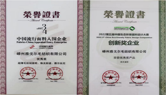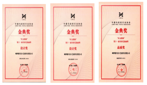公司选送的“毛丝绒衬衫面料”荣获“最佳匠心品质奖”,“绒面提花呢”荣获“艺术设计奖”,“纯毛双面短顺呢”荣获“匠心品质奖”