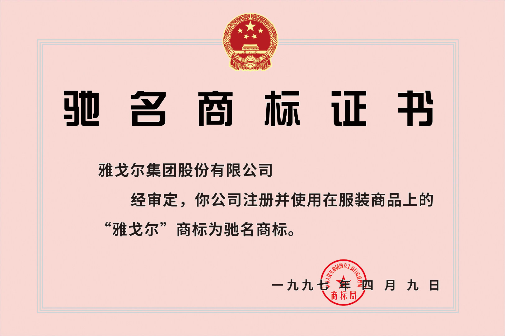 “雅戈尔”品牌获得国家商标局颁发的“驰名商标证书”。