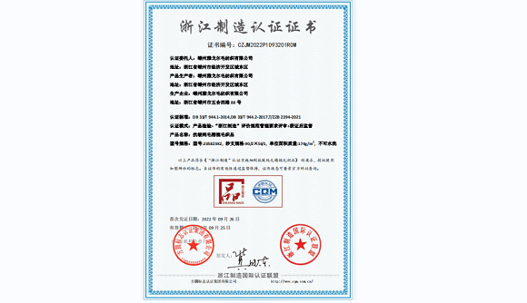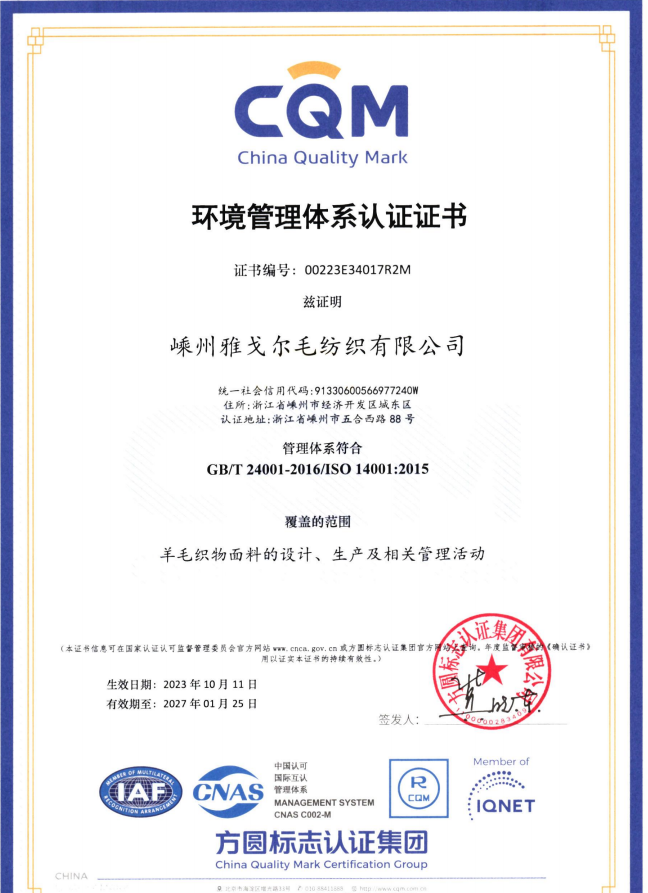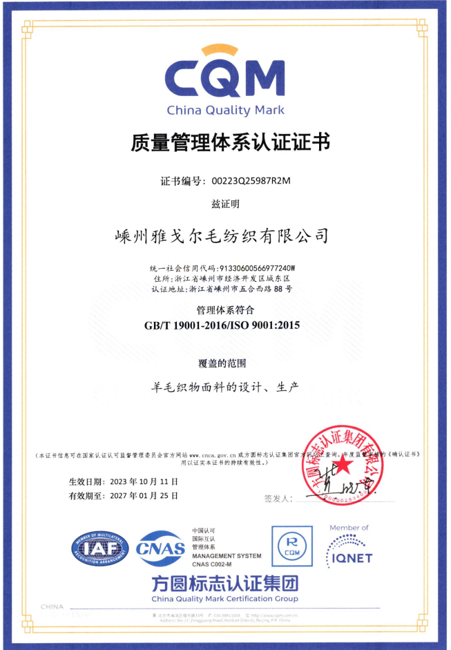 雅戈尔毛纺荣获“浙江制造认证”证书。