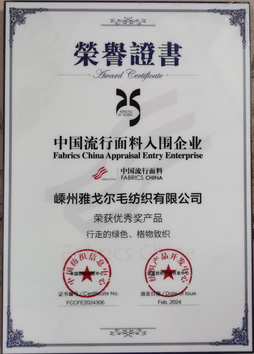雅戈尔毛纺研发的峰峦叠翠、麻代尔羊毛衬衫面料和仿针织休闲呢均被评为中国流行面料优秀奖。