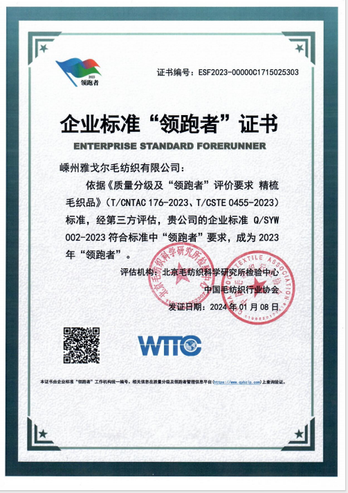 雅戈尔毛纺制定的《抗皱纯毛精梳毛织品》 “浙江制造”团体标准,通过了浙江省品牌建设联合会审批,自2021年10月2日起发布实施。