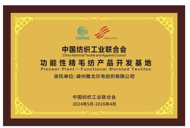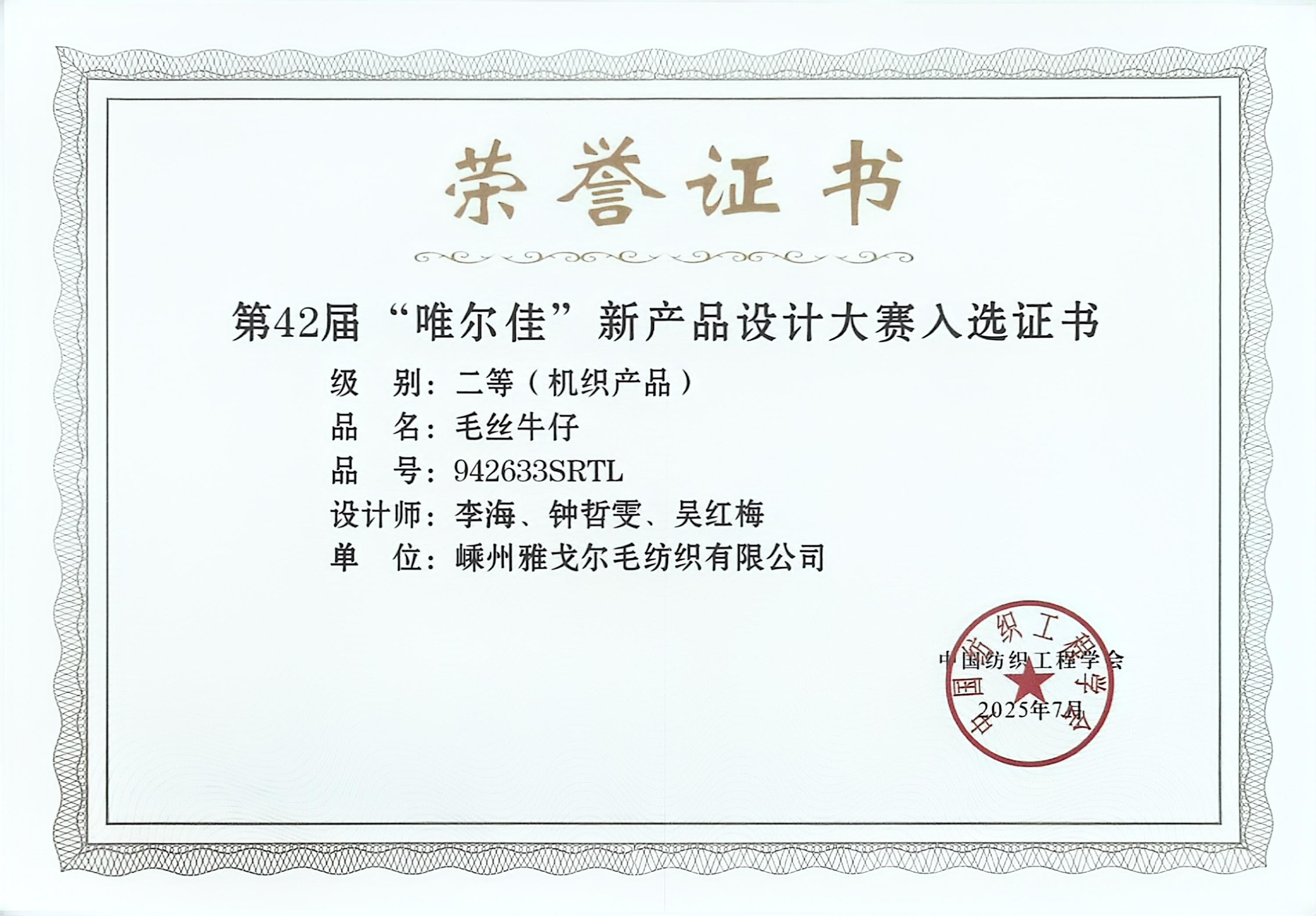 雅戈尔毛纺荣获第38届“唯尔佳”优秀新产品评比二等奖和三等奖。