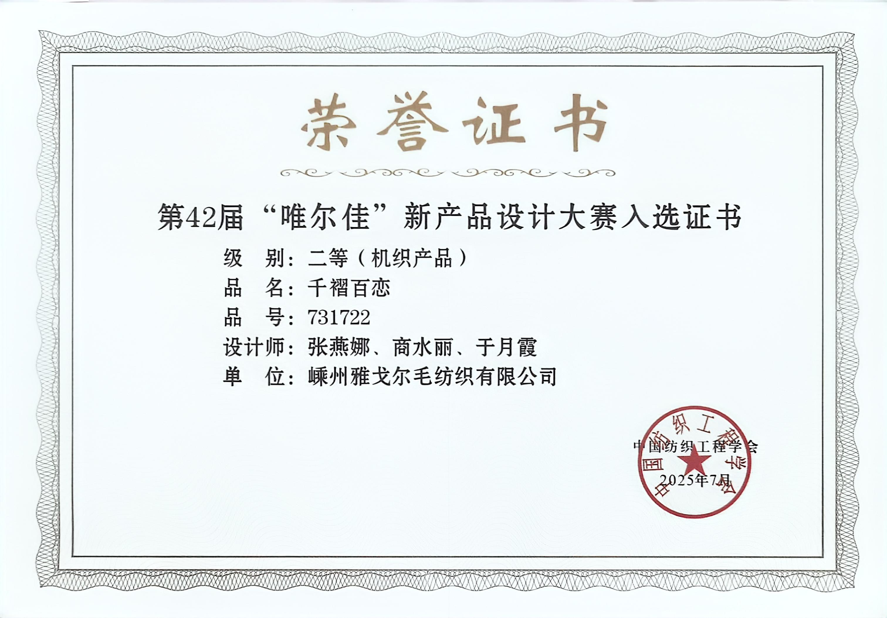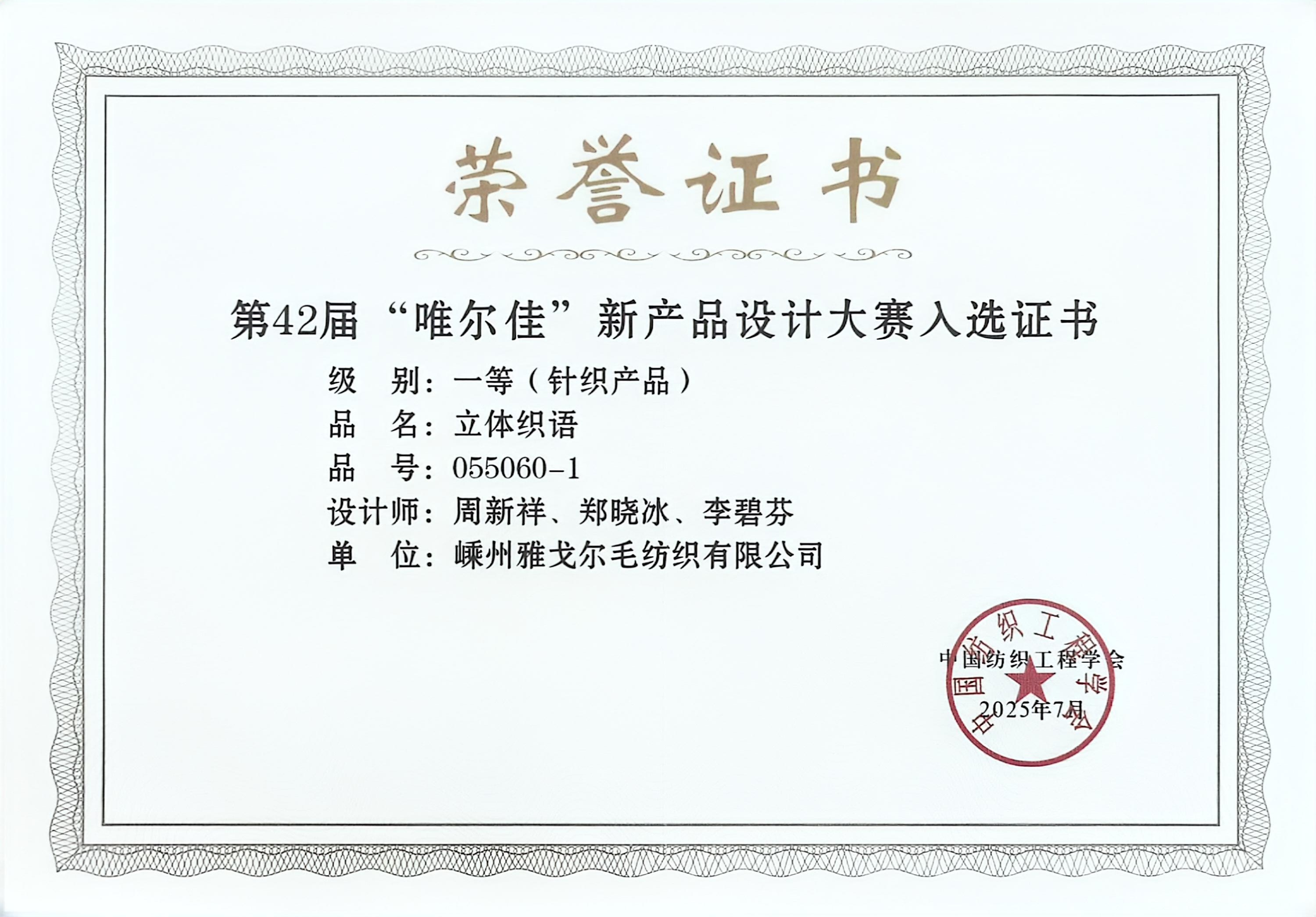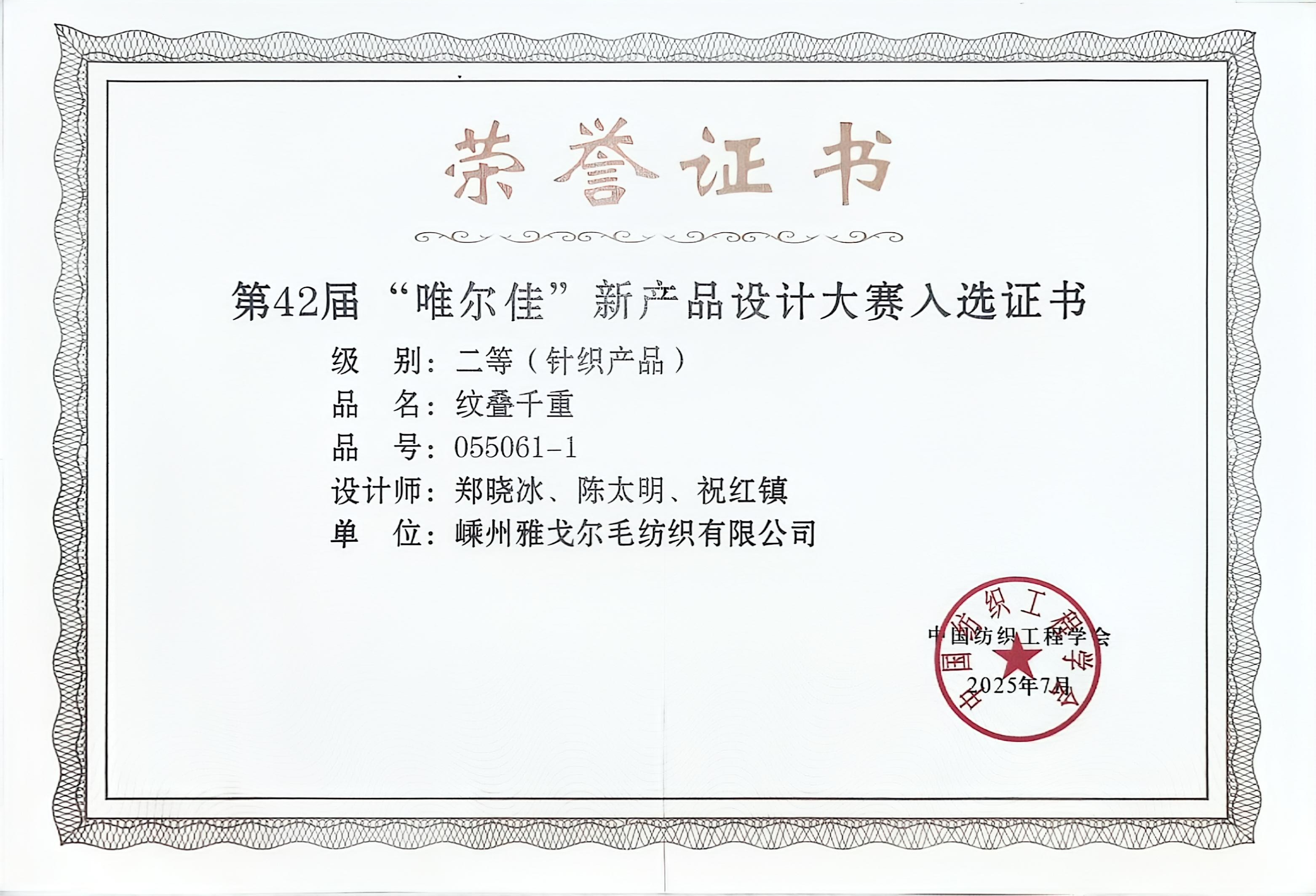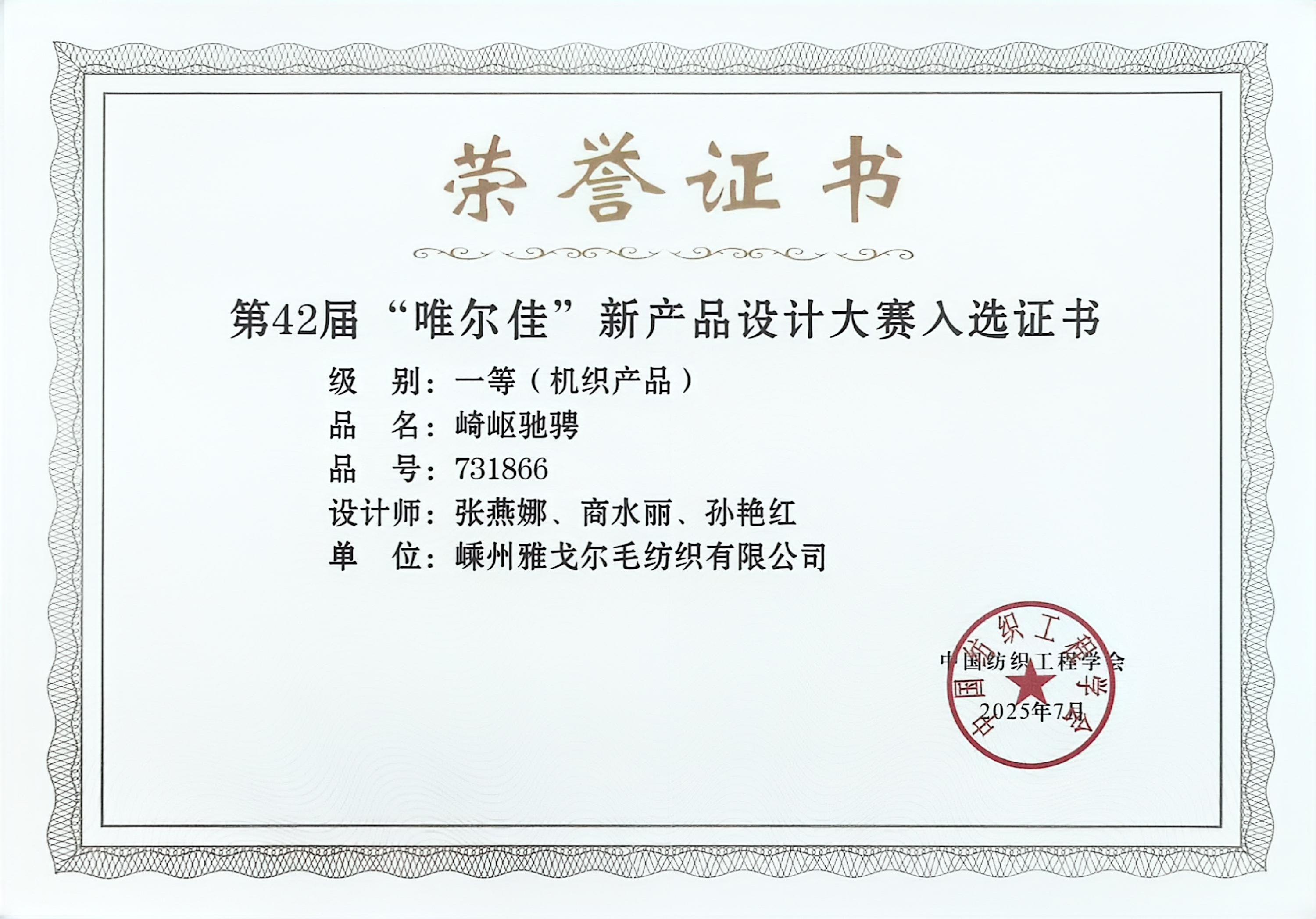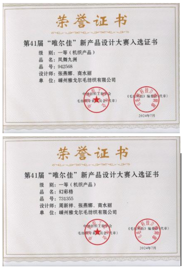经中国纺织工程学会毛纺织专业委员会、《毛纺科技》编辑部认证,雅戈尔毛纺荣获第41届“唯尔佳”优秀新产品设计大赛一等奖2个、二等奖2个、三等奖7个。