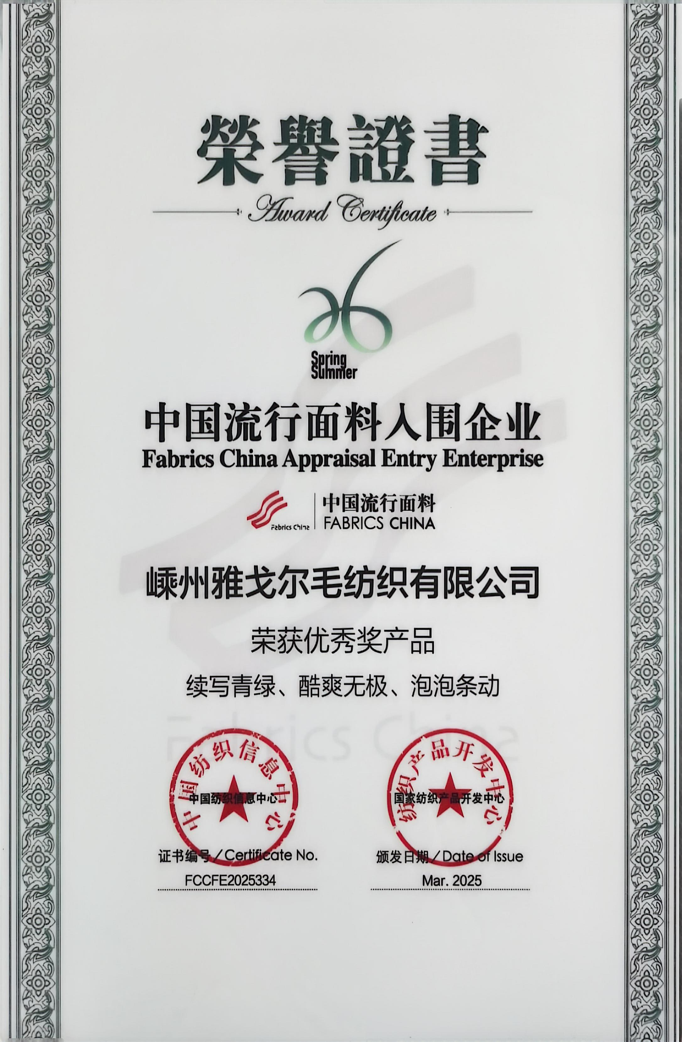 雅戈尔毛纺研发的流星雨、双弹防风面料荣获中国流行面料优秀奖。