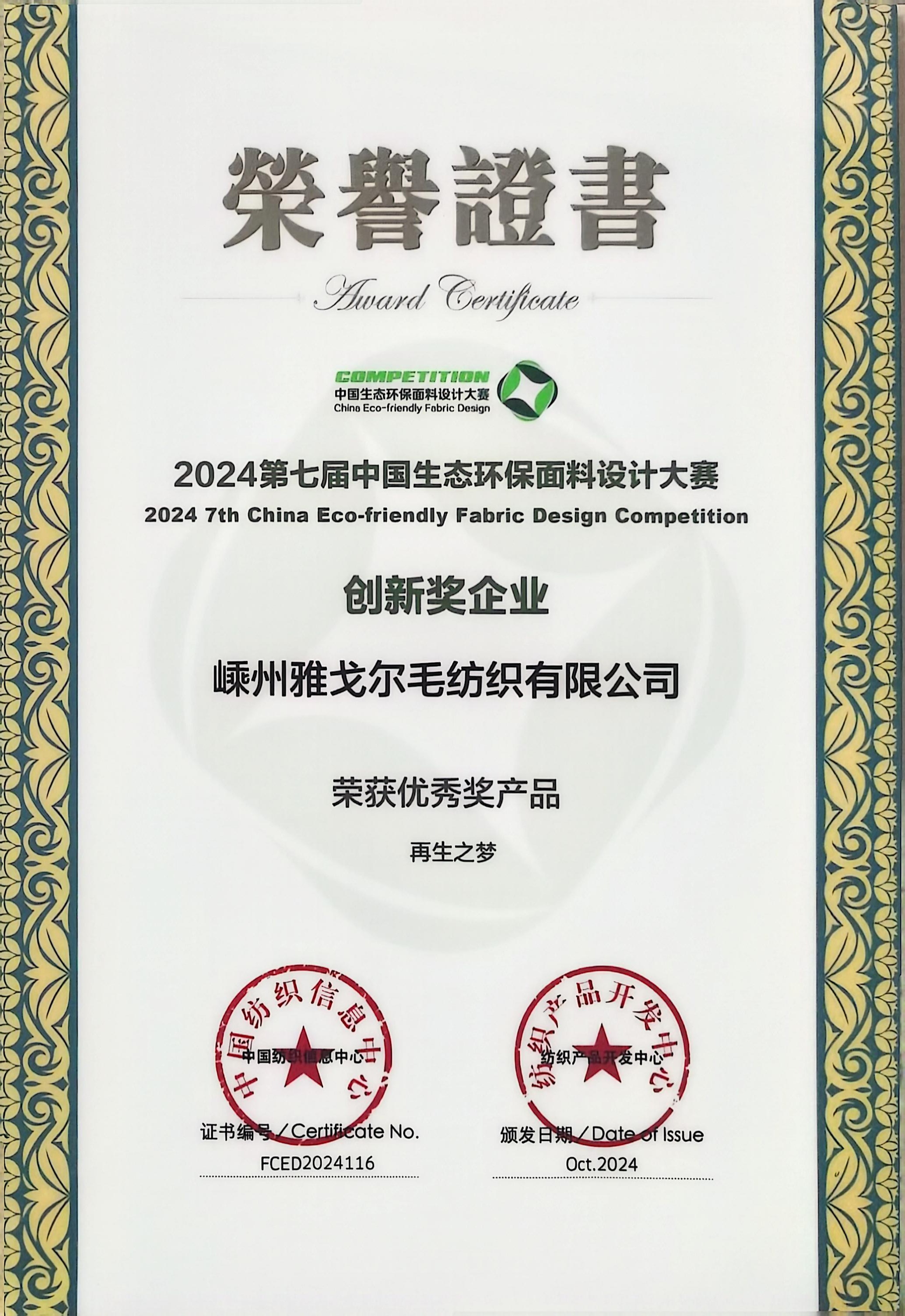 雅戈尔毛纺研发的“再生之梦”荣获中国生态环保面料创新奖企业。
