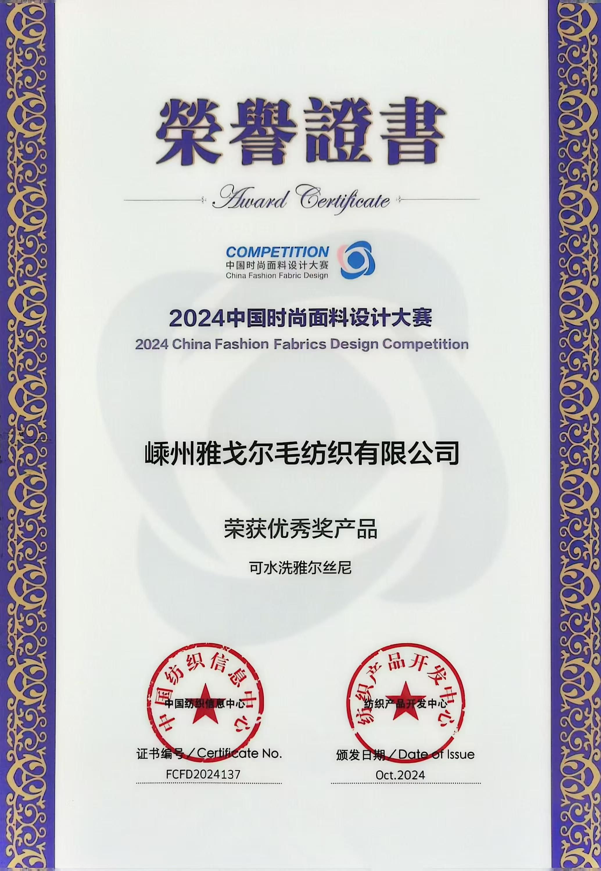 雅戈尔毛纺研发的“可水洗雅尔丝尼”荣获中国时尚面料优秀奖。