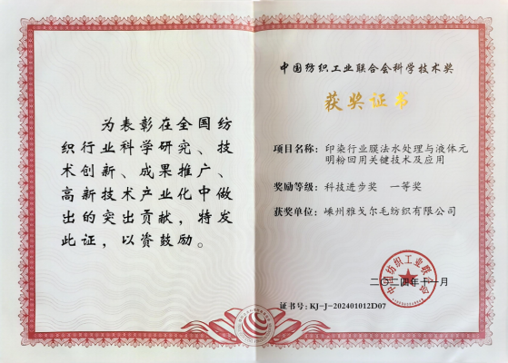 雅戈尔毛纺荣获2024年度中国纺织工业联合会“科技进步一等奖”荣誉。