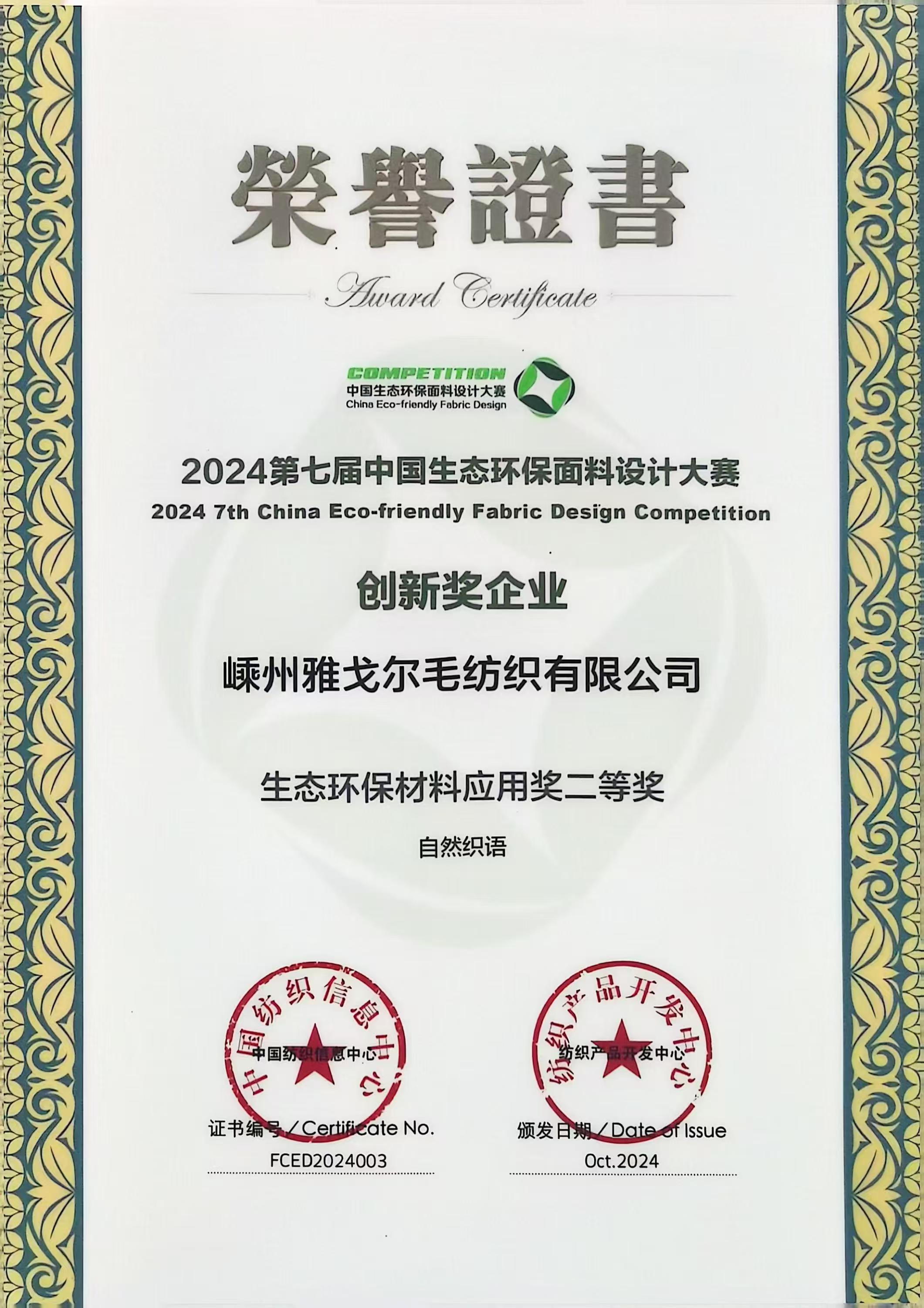 雅戈尔毛纺研发的“自然织语”荣获中国生态环保面料应用奖二等奖。