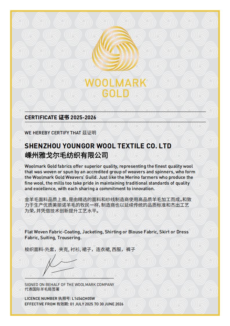 雅戈尔毛纺被国际羊毛局授予“金羊毛”标志,全国仅5家企业获得该荣誉,代表产品品质国际领先。