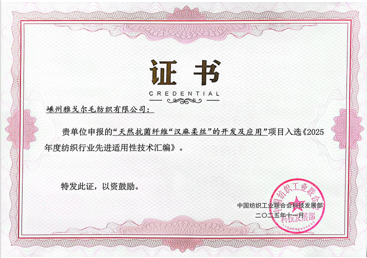 “天然抗菌纤维“汉麻柔丝”的开发及应用”项目入选《2025年度纺织行业先进适用性技术汇编》