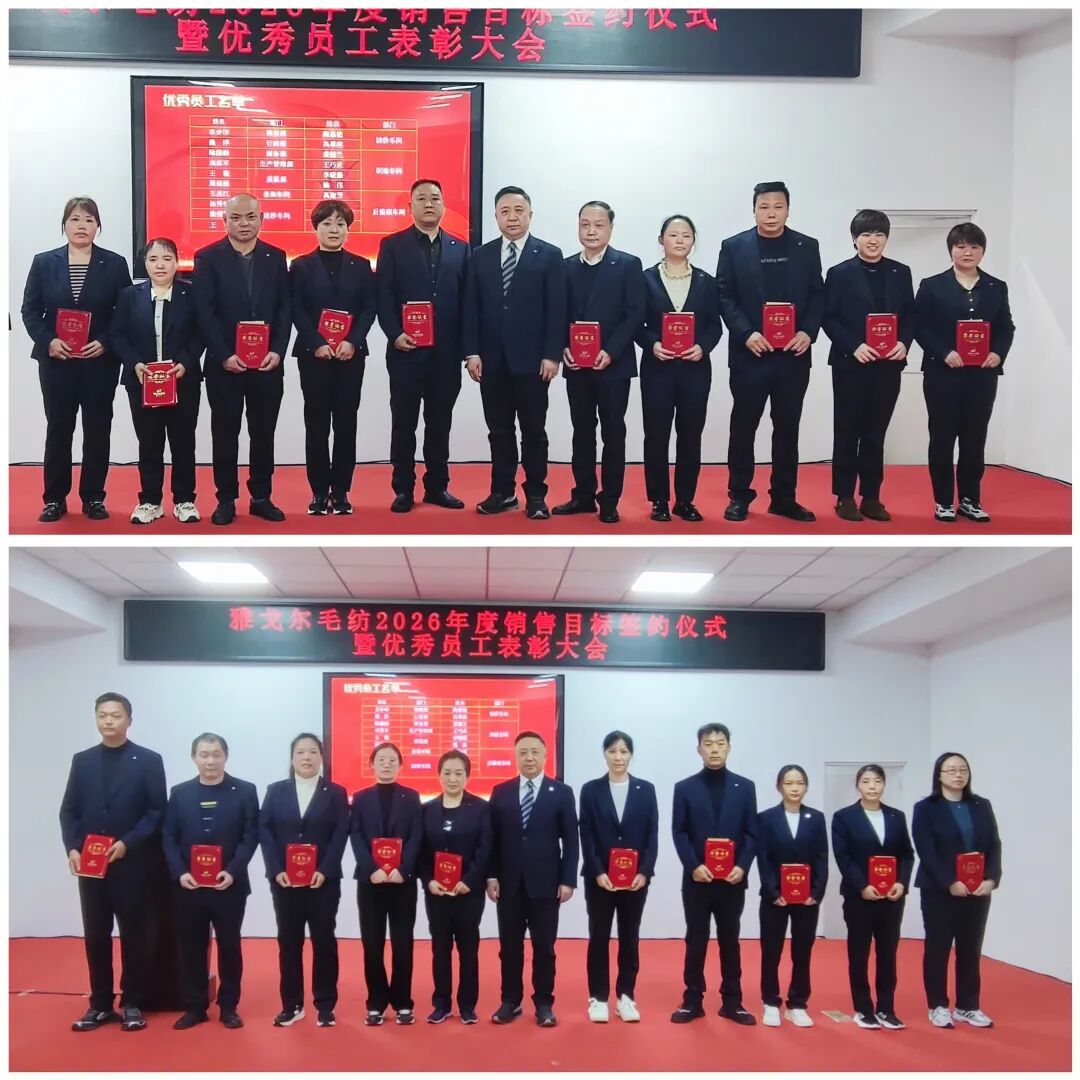 2月26日下午,雅戈尔毛纺新春第一会——2026年销售目标签约仪式暨优秀员工表彰大会隆重举行。此次大会,既是收心归位、擂鼓出征的动员会,也是表彰先进、锚定目标的誓师会,为公司新一年高质量发展吹响奋进号角。周新祥总经理出席大会为优秀员工颁奖,并与销售部门签署销售目标责任书。